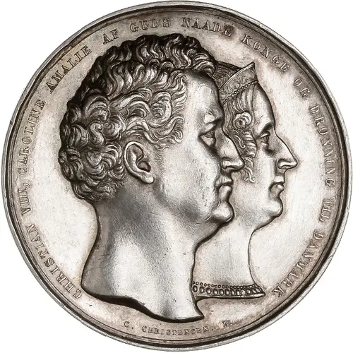 | Obverse lettering | CHRISTIAN VIII, CAROLINE AMALIE AF GUDS NAADE KONGE OG DRONNING TIL DANMARK C. CHRISTENSEN |