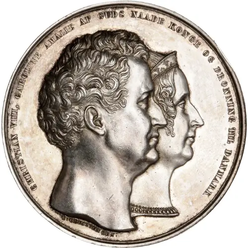 | 正面铭文 | CHRISTIAN VIII, CAROLINE AMALIE AF GUDS NAADE KONGE OG DRONNING TIL DANMARK C. CHRISTENSEN |