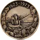 A three-masted ship sailing right with tree-covered hills in the background. The dates 1623 1973 at the top with a wreath of strawberries and strawberry leaves around the outside. |