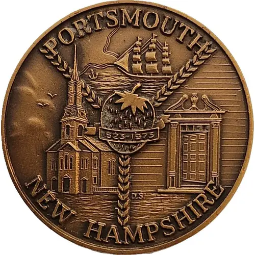 | Obverse description | The image is divided into three sections by stylized chains. The sections include a map of the New Hampshire coast with a three-masted ship at the top, a colonial style doorway and artist`s initials on the right, and a church on the left. Where joined in the middle, the chains are superimposed by a strawberry with a ribbon displaying the dates 1623-1973. The image is surrounded by the words `PORTSMOUTH NEW HAMPSHIRE`. |