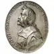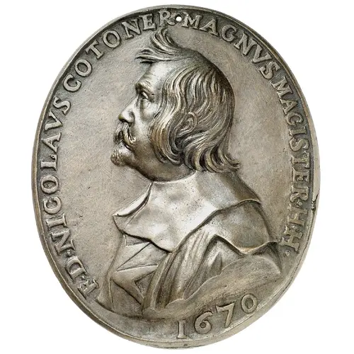 A bust of Grandmaster Nicolas Cotoner facing left surrounded by lettering. |
