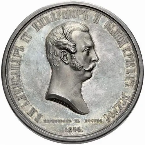 | Obverse lettering | Б.М. АЛЕКСАНДРЪ II ИМПЕРАТОРЪ И САМОДЕРЖЕЦЪ ВСЕРОС. КОРОНОВАНЪ ВЪ МОСКВѢ 1856. (Translation: By God’s grace Alexander II Emperor and Autocrat of All Russia Crowned in Moscow 1856) |