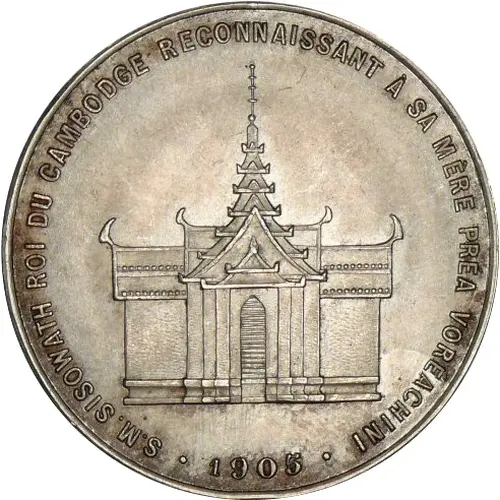 | Obverse lettering | A/S.M. SISOWATH ROI DU CAMBODGE RECONNAISSANT A SA MÈRE PRÉA VORÉACHINI. |