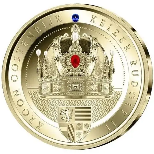 | Obverse description | Ornate imperial crown adorned with pearls and colorful gemstones, prominently featuring a red gem at the center and a blue gem on top. Below the crown sits a quartered coat of arms, combining various heraldic symbols associated with the Habsburg dynasty. |