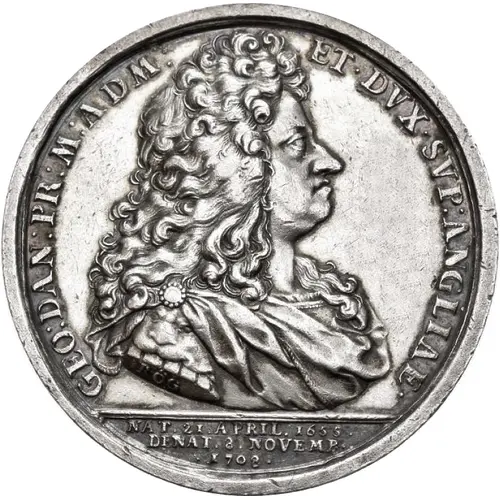 | Obverse lettering | GEO : DAN : PR : M : ADM : | ET : DVX : SVP : ANGLIAE. ROG _____________ NAT. 21 APR. 1655 DENAT. 8 NOVEMB. 1708 |