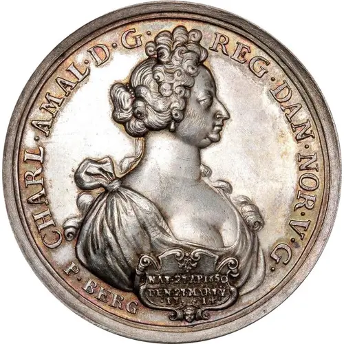 CHARL · AMAL · D · G · REG · DAN · NOR · V · G · P · BERG NAT. 27 AP. 1650 DEN . 27. MARI · 1714 · (Translation: Charlotte Amalia, by the Grace of God, Queen of Denmark, Norway, of the Wends and the Goths) |