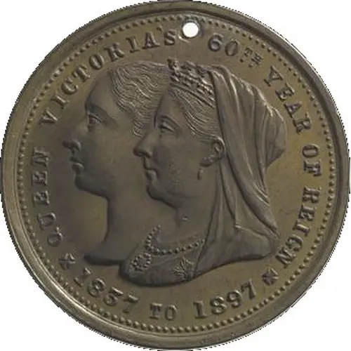 Jugate busts, young & old Queen Victoria; around, QUEEN VICTORIA`S 60TH YEAR OF REIGN * 1837 TO 1897 * (stops on either side of date in form of crosses). |