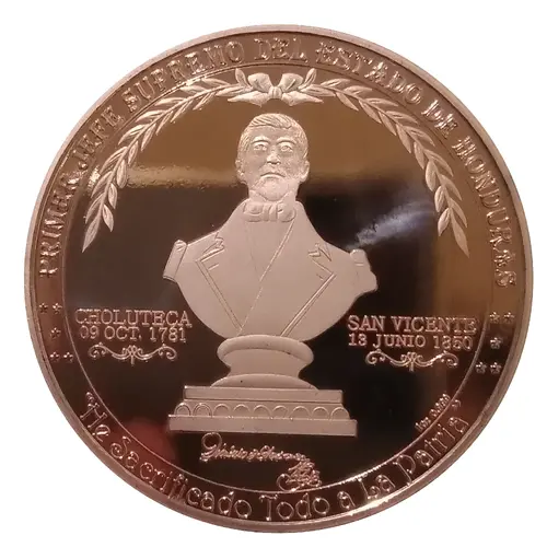 | Obverse description | At the center, the image of Dionisio de Herrera`s bust sculpted in 1915, positioned beneath two garlands. To the left of the bust, Herrera`s place and date of birth; to the right, his place and date of death. Below, the signature of the statesman. At the top of the outer circle, the commemorated title, and at the bottom, a famous quote from the former leader. Both texts separated by 5 stars representing honduran flag. Weight and fineness. |