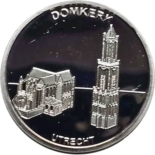 The obverse features a design showcasing the Dom Tower (Domtoren) and a portion of the Dom Church (Domkerk) in Utrecht, the Netherlands. The Dom Tower is depicted as a tall, detailed structure, standing prominently on the right, while the Dom Church appears to the left with its architectural details highlighted. |