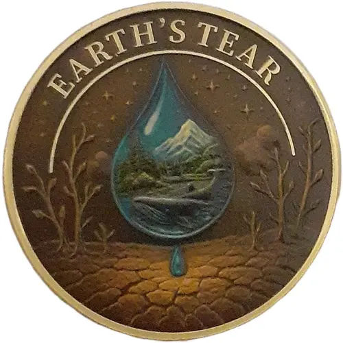 | توضیحات روی مدال | In center, water drop with comet, mountain, forest, whale, and water body inside. Around, clouds, dried bushes and soil, and stars. |