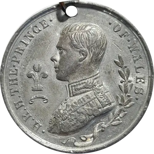 Uniformed bust of Edward, Prince of Wales, facing left. Prince`s crest and motto in field to left. Ribboned laurel branch to right and below |
