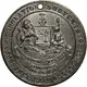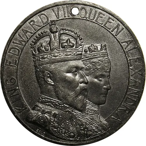 Conjoined crowned busts of King Edward and Queen Alexandra, left. Legend on a raised band around. The maker’s name is below the truncation of the King’s bust. |