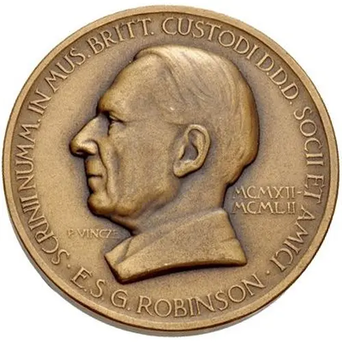 | Obverse lettering | SCRINI NUMM.IN MUS.BRITT. CUSTODI D.D.D. SOCII ET AMICI MCMXII- MXMLII E.S.G. ROBINSON |
