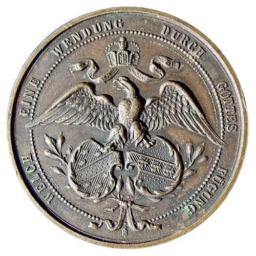 The crowned Imperial German Eagle holding the shields of Alsace l. and Lorraine r. Legend around. |