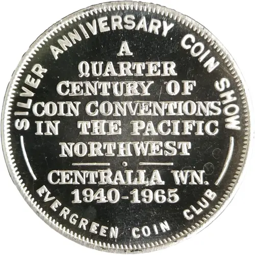 | Obverse lettering | SILVER ANNIVERSARY COIN SHOW A QUARTER CENTURY OF COIN CONVENTIONS IN THE PACIFIC NORTHWEST CENTRALIA WN. 1940-1965 EVERGREEN COIN CLUB |