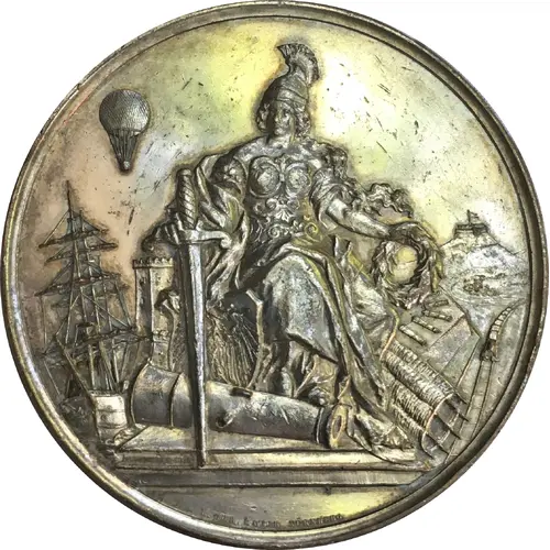 | Obverse description | Seated armored figure of Germania holding sword and laurel wreath, different objects surrounding her (ship, train, cannon`s, caste, hot-air balloon). |