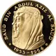 Flag bearing the Shahada above emblem of Saudi Arabia (two crossed swords with a palm tree in the space above and between the blades). Mint mark and gold fineness on each side of the swords |
