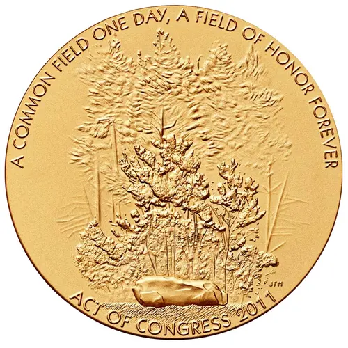 The obverse of the medal features the hemlock groves behind the memorial boulder at the Flight 93 Memorial, a simple reminder of loss and healing. |