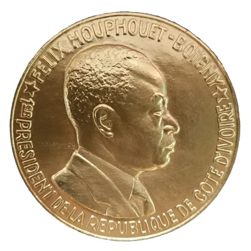 | Obverse lettering | *FELIX HOUPHOUET-BOIGNY* M. Delannoy 1eR PRESIDENT DE LA REPUBLIQUE DE COTE D’IVOIRE (Translation: *FELIX HOUPHOUET-BOIGNY* M. Delannoy 1st PRESIDENT OF THE REPUBLIC OF COTE D`IVOIRE) |