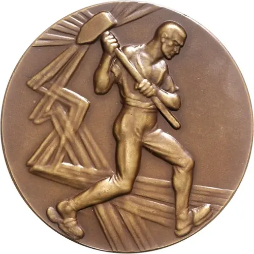 | Obverse description | Blacksmith with raised hammer to the right in front of stylized representation of wires. |