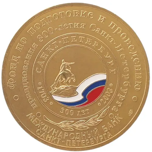 Фонд по подготовке и проведению празднования 300-летия Санкт-Петербурга САНКТ-ПЕТЕРБУРГ * 1703 * 300 ЛЕТ * 2003 * МЕЖДУНАРОДНЫЙ БАНК СПМД САНКТ-ПЕТЕРБУРГА (Translation: Foundation for the preparation and holding of the celebration of the 300th anniversary of Saint Petersburg Saint Petersburg * 1703 * 300 years * 2003 * International Bank of Saint Petersburg SPMD) |