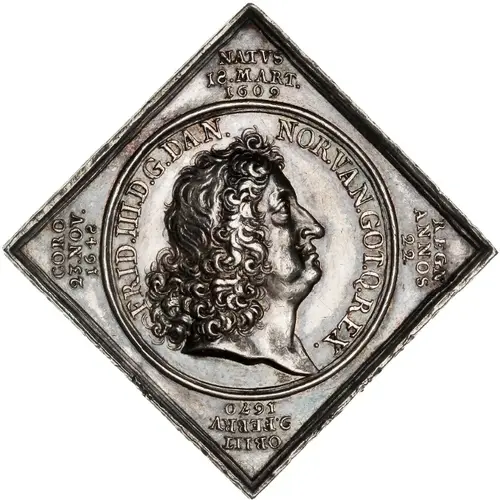 | Obverse lettering | FRID . III . D . G . DAN . NOR . VAN . GOT . Q . REX. ________________________ NATUS | 18 MART. | 1609 REGN | ANNOS | 22 OBLIT | 9 FEBRV | 1670 GORO | 23 NOV. | 1648 (Translation: Frederik III Dei Gratia King of Denmark (DAN), Norway (NOR), the Wends (VAN) and the Goths (GOT). Born march 18th 1609 Reigned for 22 years Death febrary 9th 1670 Enthroned 23rd november 1648) |