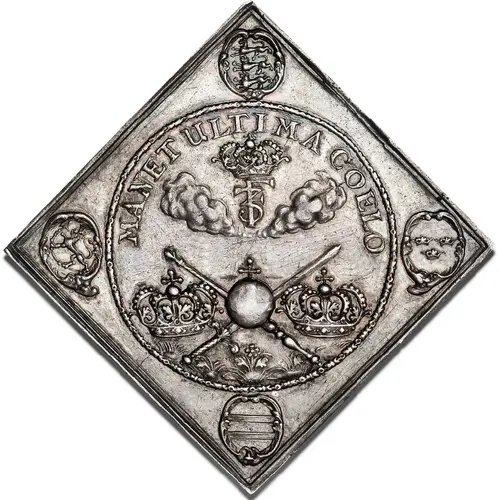 Imperial Orb over crossed Royal Scepter and Sword with crowns of Denmark and Norway at both sides. Above, in the sky, the crowned monogram of King Frederik III is raising above clouds, in heaven. All is within a circle with small arms in quarters. |