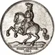 King Frederik IV with long robe and feather hat riding a prancing horse. Legend and date below. |