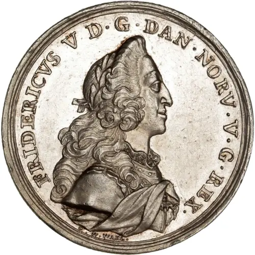 FRIDERICVS • V • D • G • DAN • NORV • V • G • REX • (Translation: Frederik V Dei Gratia King of Denmark, Norway, the Wends and the Goths) |