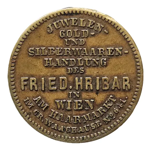 | Leyenda del anverso | JUWELEN - GOLD - UND SILBERWAAREN - HANDLUNG DES FRIED. HRIBAR IN WIEN AM HAARMARKT IM GR. WAAGHAUSE No. 641. (Translation: JEWELRY - GOLD - AND SILVERWARE - STORE OF FRIED. HRIBAR IN VIENNA AT HAARMARKT IN THE GREAT WEIGHT HOUSE No. 641.) |