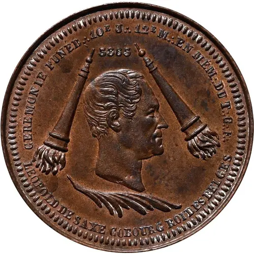 | Obverse lettering | CÉRÉMONIE FUNÉR 10 E J 12E M EN MÉM DUT C F 5865 LEOPOLD DE SAXE COBURG ROI DES BELGES |