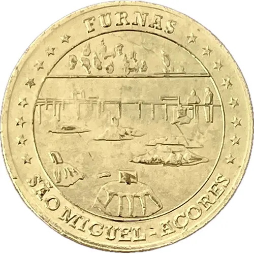 | Descrição do anverso | Concentric circles. Lettering in outer circle. Two sets of 8 stars. Inner circle. Scene from Furnas Lake. With trees, fumarolas (steam vents) and mounds dug up where cozido (stew) is cooked for several hours using geothermal heat. |