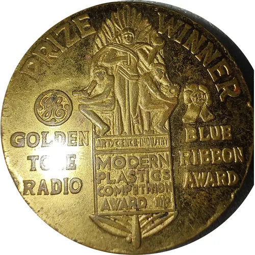 | Obverse lettering | PRIZE WINNER GOLDEN TONE RADIO ART SCIENCE INDUSTRY MODERN PLASTICS COMPETITION AWARD BLE RIBBON AWARD |