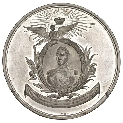 | Obverse description | Uniformed bust of the Duke of Wellington facing, bare head within circular medallion and olive branches; Angel supporting it from above |