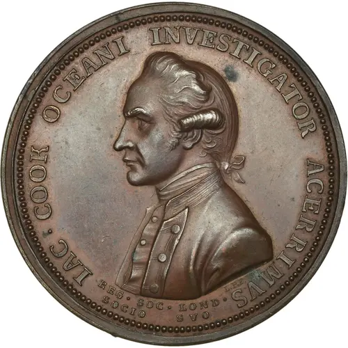 | Obverse lettering | IAC. COOK OCEANI INVESTIGATOR ACERRIMVS REG . SOC . LOND . SOCIO . SVO. (Translation: The most intrepid investigator of the seas) |