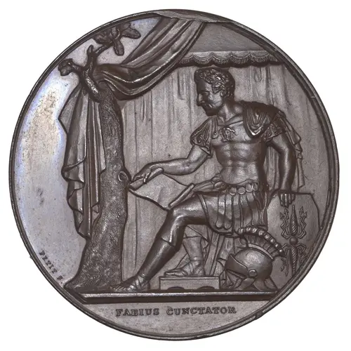 | Obverse description | The Duke of Wellington, in the guise of a Roman general seated before his tent |