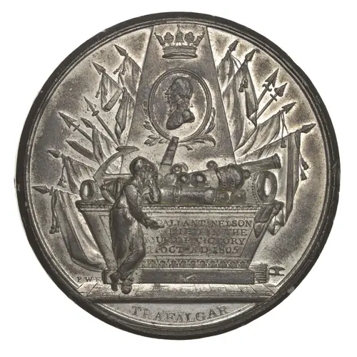 | Obverse description | Bust of Lord Nelson on a medallion, naval crown above on an obelisk at the base of which are trophies of war; seaman weeping leaning against the base |
