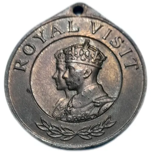 | Popis líce | Conjoined crowned and robed busts of the King and Queen, left. Signed: “PM” on the King’s shoulder. Legend on a raised band above: “ROYAL VISIT”, laurel sprigs below. |