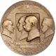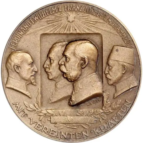 At center busts of Wilhelm II and Franz Joseph facing left, to the left Ferdinand I facing right and to the right Mohammed V facing left, rayonant star above and fasces with laurel and oak branch below. |