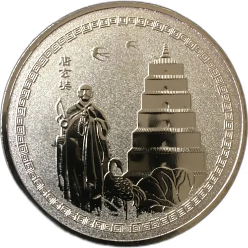 | Obverse description | Big Wild Goose Pagoda in Xian and statue of monk with herons. |