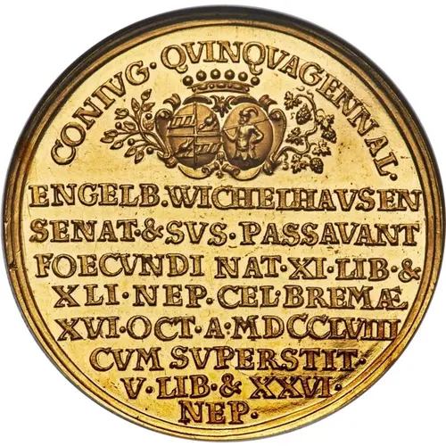 | Obverse lettering | CONIUG.QUINQUAGENNAL. ENGELB.WICHELHAUSEN SENAT.&.SVS.PASSAVANT FOECVNDI NAT.XI.LIB.& XLI. NEP. CEL. BREMÆ XVI.OCT.A.MDCCLVIII CVM SVPERSTIT. V.LIB.& XXVI. NEP |