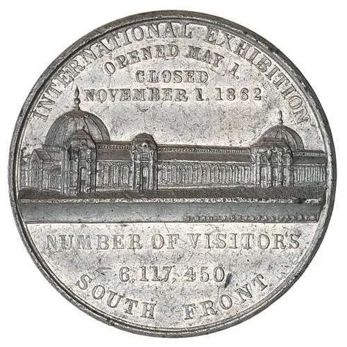 | Legenda do anverso | INTERNATIONAL EXHIBITION OPENED MAY 1. CLOSED NOVEMBER 1. 1862 NUMBER OF VISITORS 6,117,450 SOUTH FRONT |