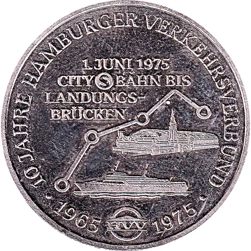 | Legenda awersu | 10 JAHRE HAMBURGER VERKEHRSVERBUND 1. JUNI 1975 CITY S BAHN BIS LANDUNGSBRUECKEN 1965 HVV 1975 |
