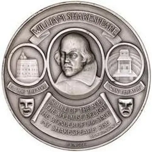 Obverse description Bust three-quarters left, flanked by the Globe and Swan Theatres within medallions