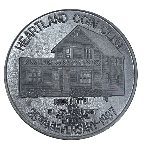 | Opschrift voorzijde | HEARTLAND COIN CLUB KNOX HOTEL 1876 EL CAJONS FIRST COMMERCIAL BUILDING 25TH ANNIVERSARY - 1987 |