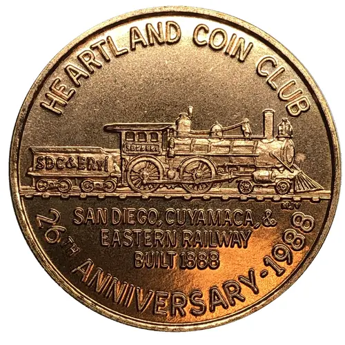 | Obverse lettering | HEARTLAND COIN CLUB SAN DIEGO, CUYAMACA, & EATERN RAILWAY BUILT 1888 26TH ANNIVERSARY - 1988 |