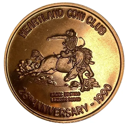 | Obverse lettering | HEARTLAND COIN CLUB BRONC BUSTING LAKESIDE RODEO 28th ANNIVERSARY - 1990 |