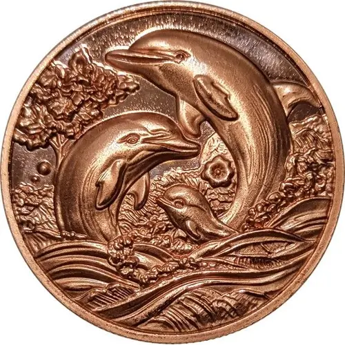 This beautifully minted 1 AVDP oz copper round from Central Bullions features a high-relief design of a dolphin family in their natural ocean habitat. The design captures a serene and joyful moment as two adult dolphins leap playfully among waves and coral, while a baby dolphin swims below them — a touching symbol of nature, family, and harmony. Surrounding the dolphins are finely detailed underwater plants, ocean currents, and sea flora, all brought to life with rich, sculpted textures and dynamic movement. The high-relief strike enhances the sense of depth and realism, making the artwork truly pop from the surface. |