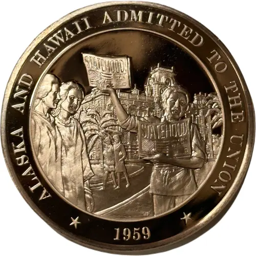 | Obverse lettering | ALASKA AND HAWAII ADMITTED TO THE UNION JF 1959 |