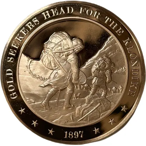 | Obverse lettering | GOLD SETTLERS HEAD FOR THE KLONDIKE JF 1897 |